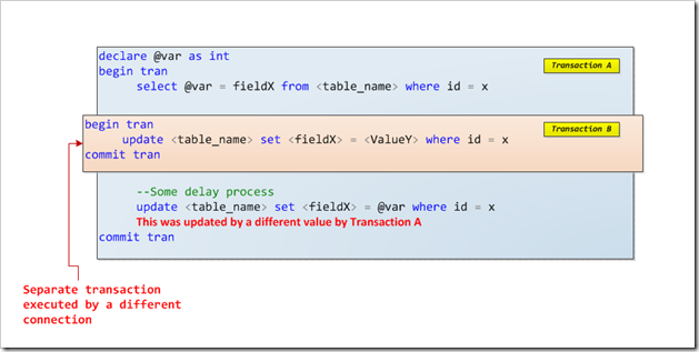 Lost Update – This can take place in two ways. First scenario: it can take place when data that has been updated by one transaction (Transaction A), overwritten by another transaction (Transaction B), before the Transaction A commits or rolls back. (But this type of lost update can never occur in SQL Server** under any transaction isolation level)